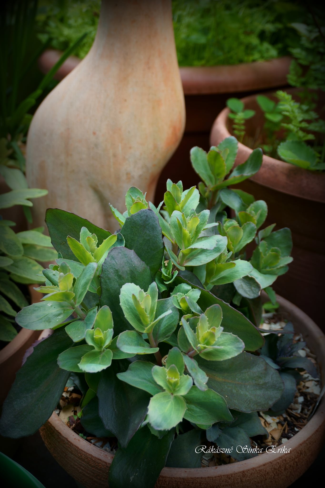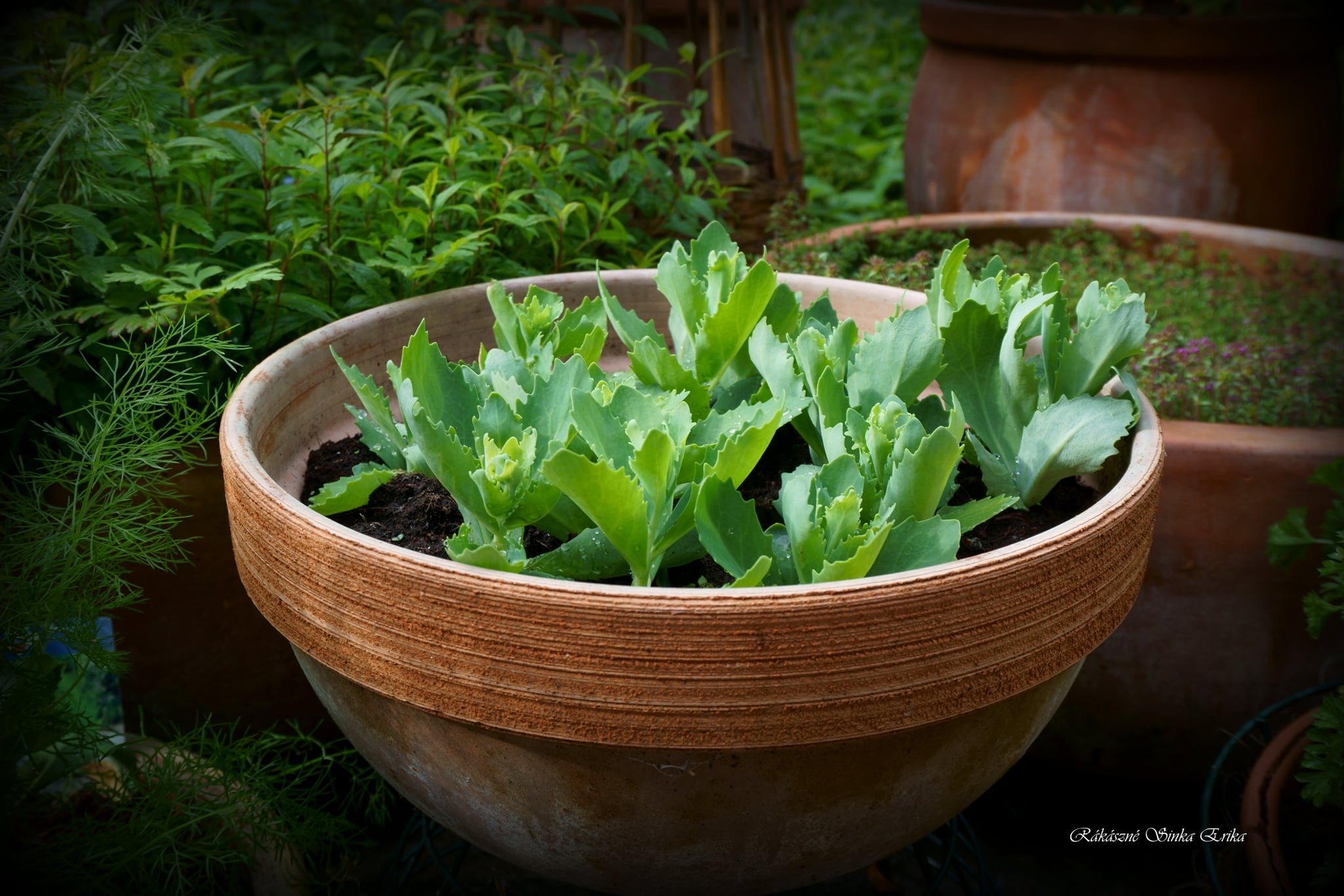 varjúhájak: bal oldali cserépben, visszavágva, jobb oldali a levágott hajtásokból új növény létrejötte.